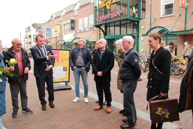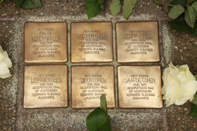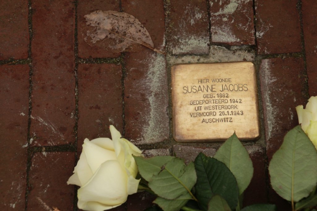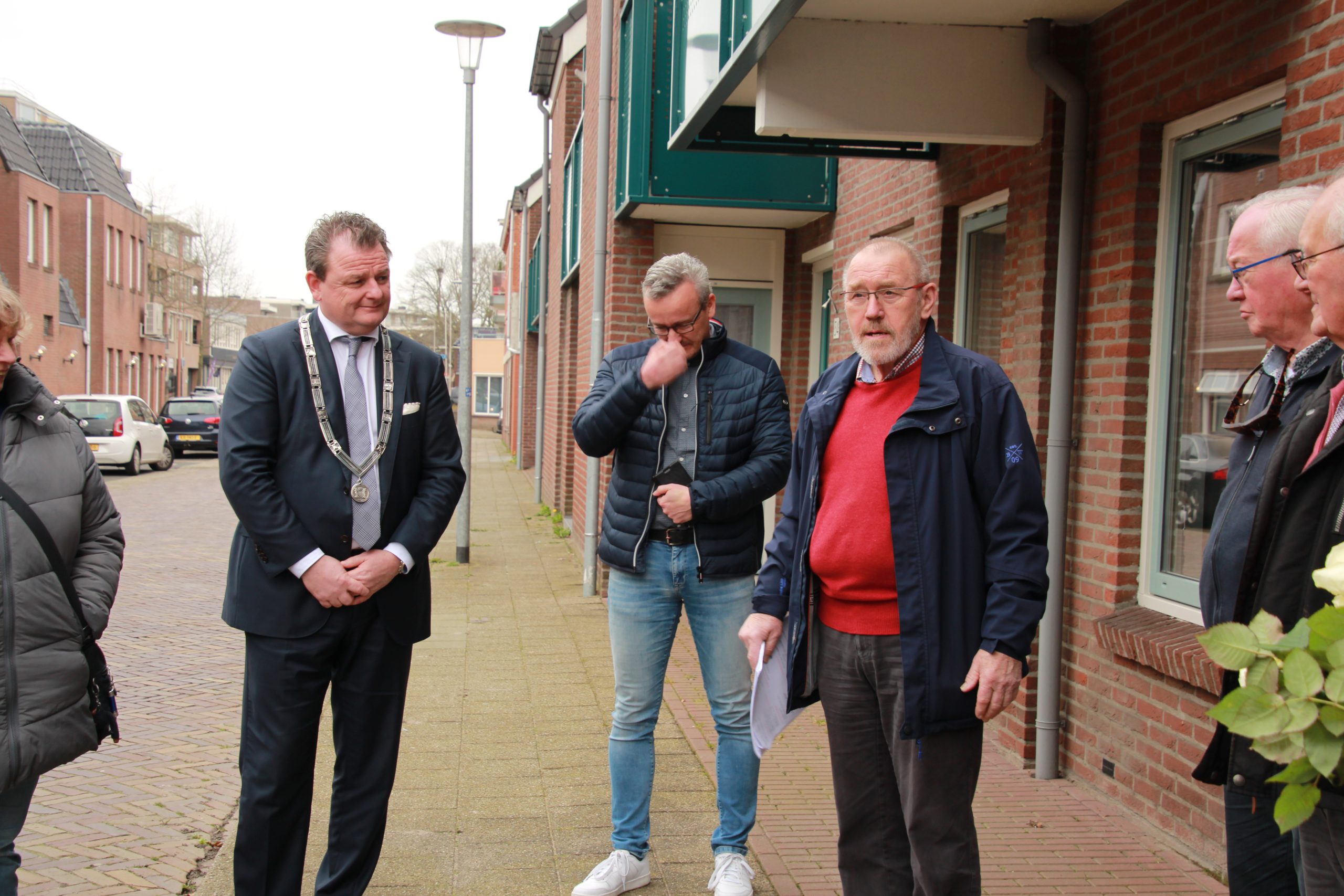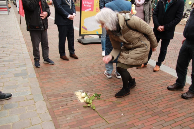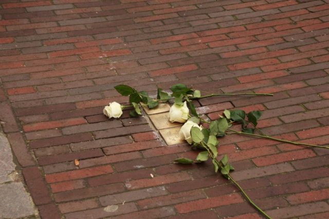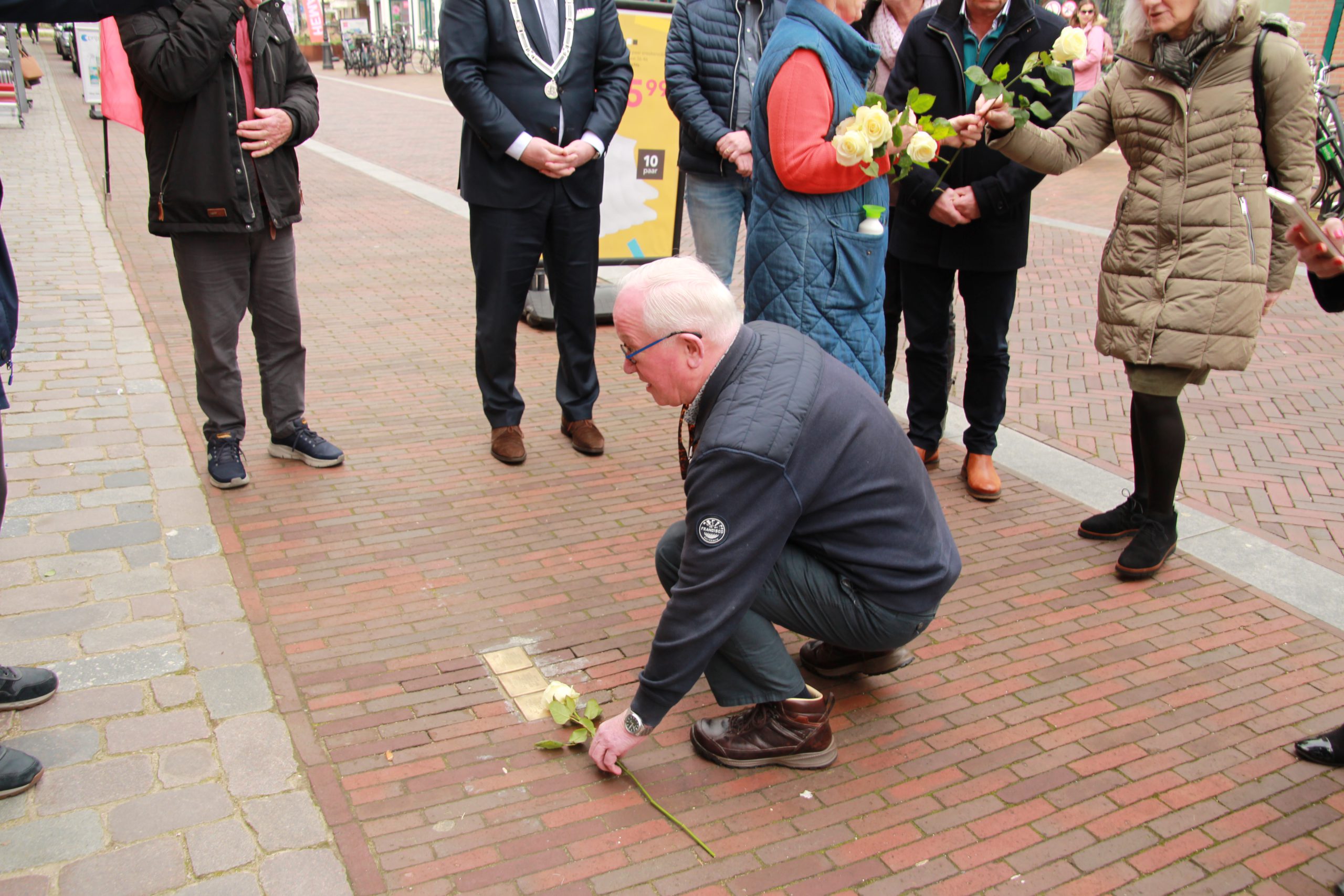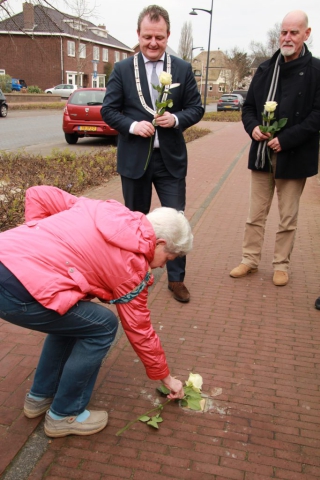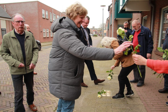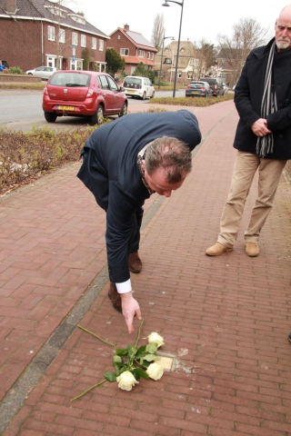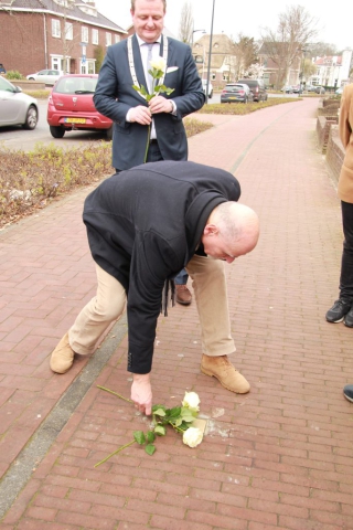 Nadat Barend Faddegon de verhalen over de 10 mensen waarvoor de Stolpersteine zijn gelegd had verteld, ging het gezelschap de straat op en legde bij elke Stolpersteine een witte roos.